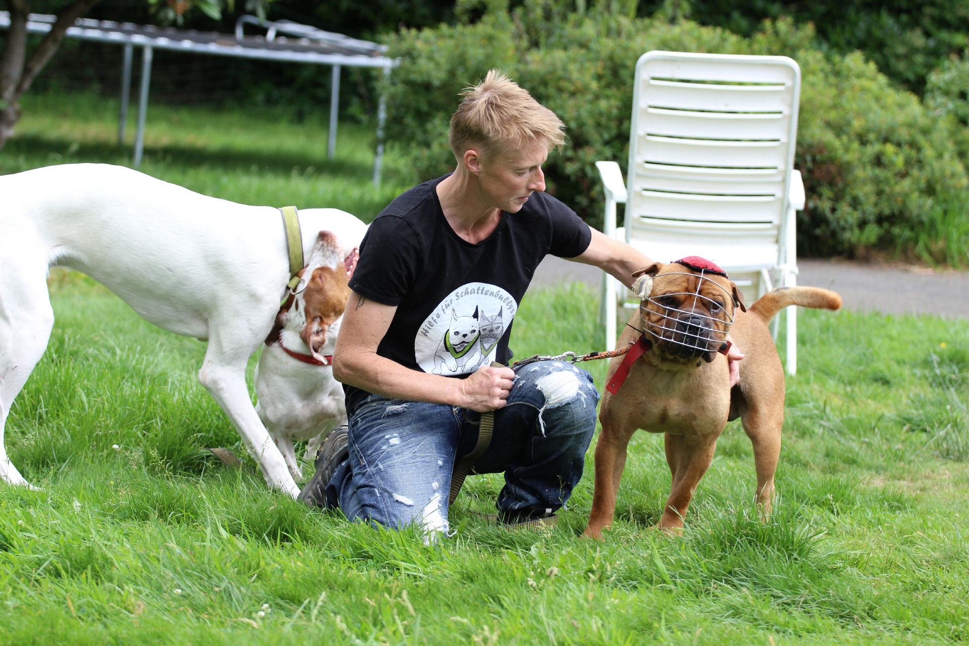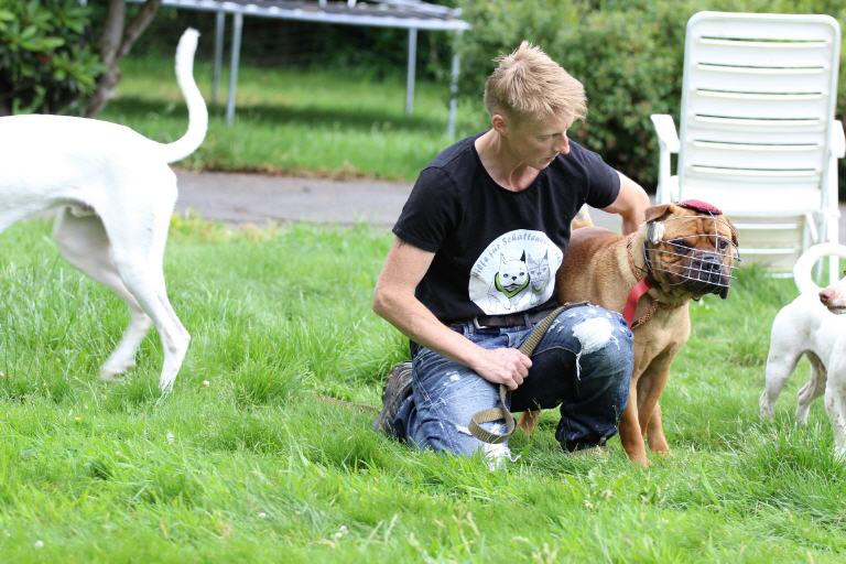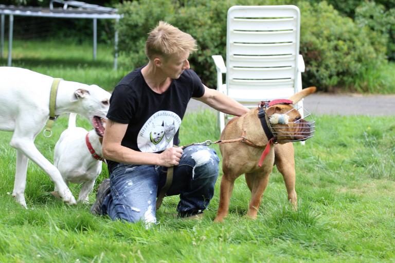 Klar, in einem Sicherheitszwinger, aber ohne Kontakt zu anderen Hunden und Menschen und ohne liebenswerte Streicheleinheiten. Denn ohne Maulkorb ging niemand an ihn heran. Wir Zwei übten zwar Maulkorbtraining, kamen aber nie bis zum Verschließen.