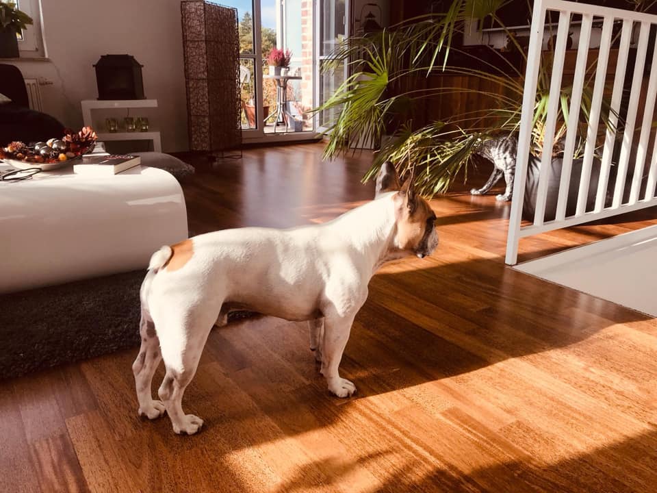 Bei fremden Hunden reagiert er normal mit Desinteresse oder ( zwar selten aber möglich) mit bellen .