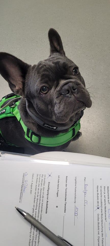 Rocky hatte am Dienstag, 31.08.21 seine erste Stosswellentherapie-Sitzung in der Veta-Care Klinik unter leichter Sedierung.